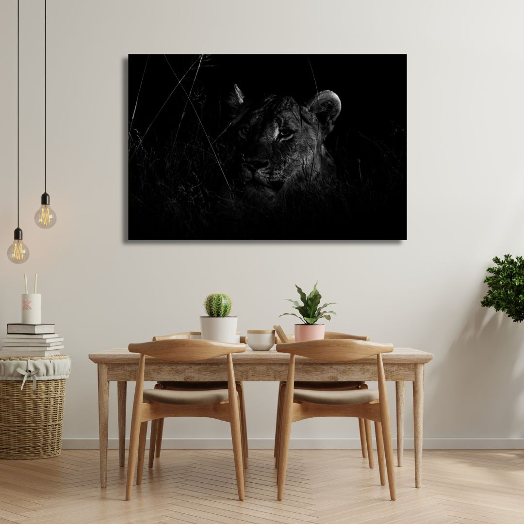 This canvas print, “Lioness At Night 2”, is the perfect piece for any space. After many hours of tracking this very illusive animal, we finally found her she decided to cross the road in front of us and lay down in a nearby grassy patch. Illuminated by the red light, I was able to briefly capture a moment so rare, almost as if she was looking straight into the lens.